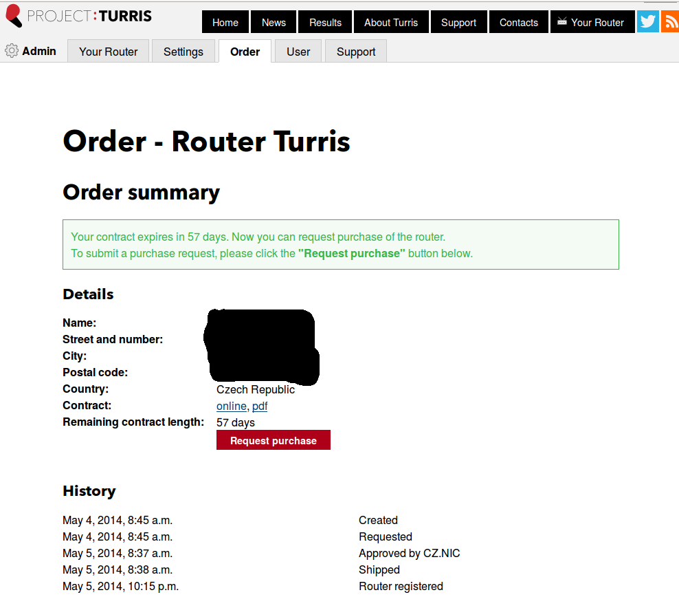 Three years ago I was lent one of the test Turris routers, that later became Turris Omnia. As promised, I'm now able to buy the machine for a symbolic prize of 1 CZK (0.04 USD).
